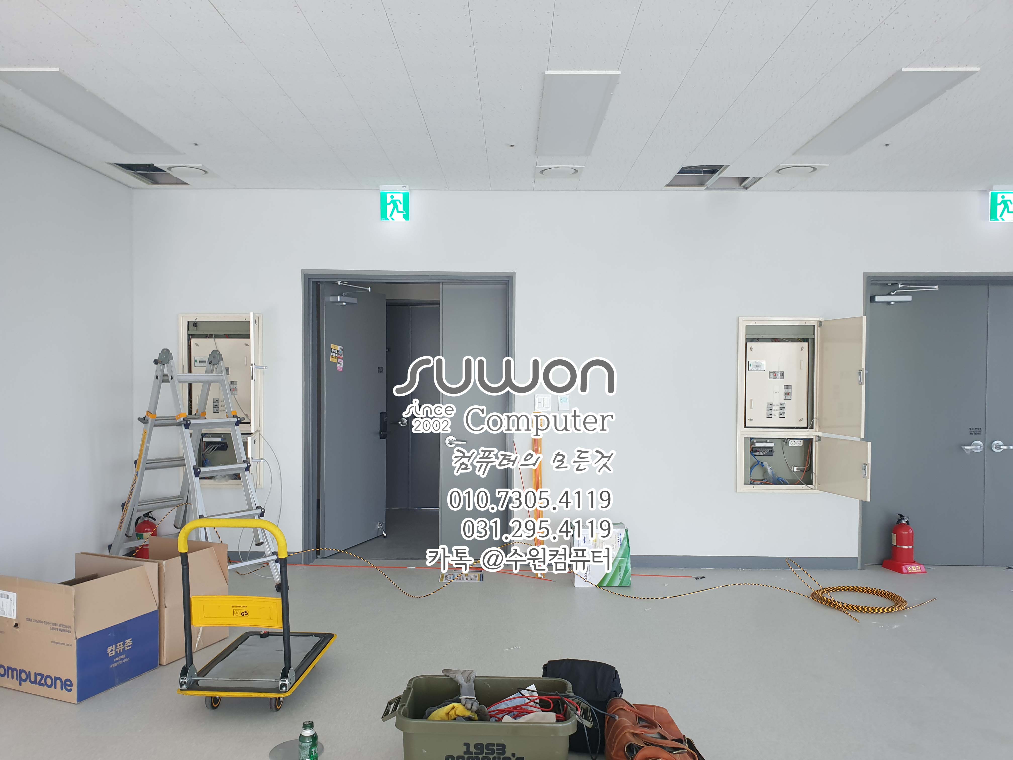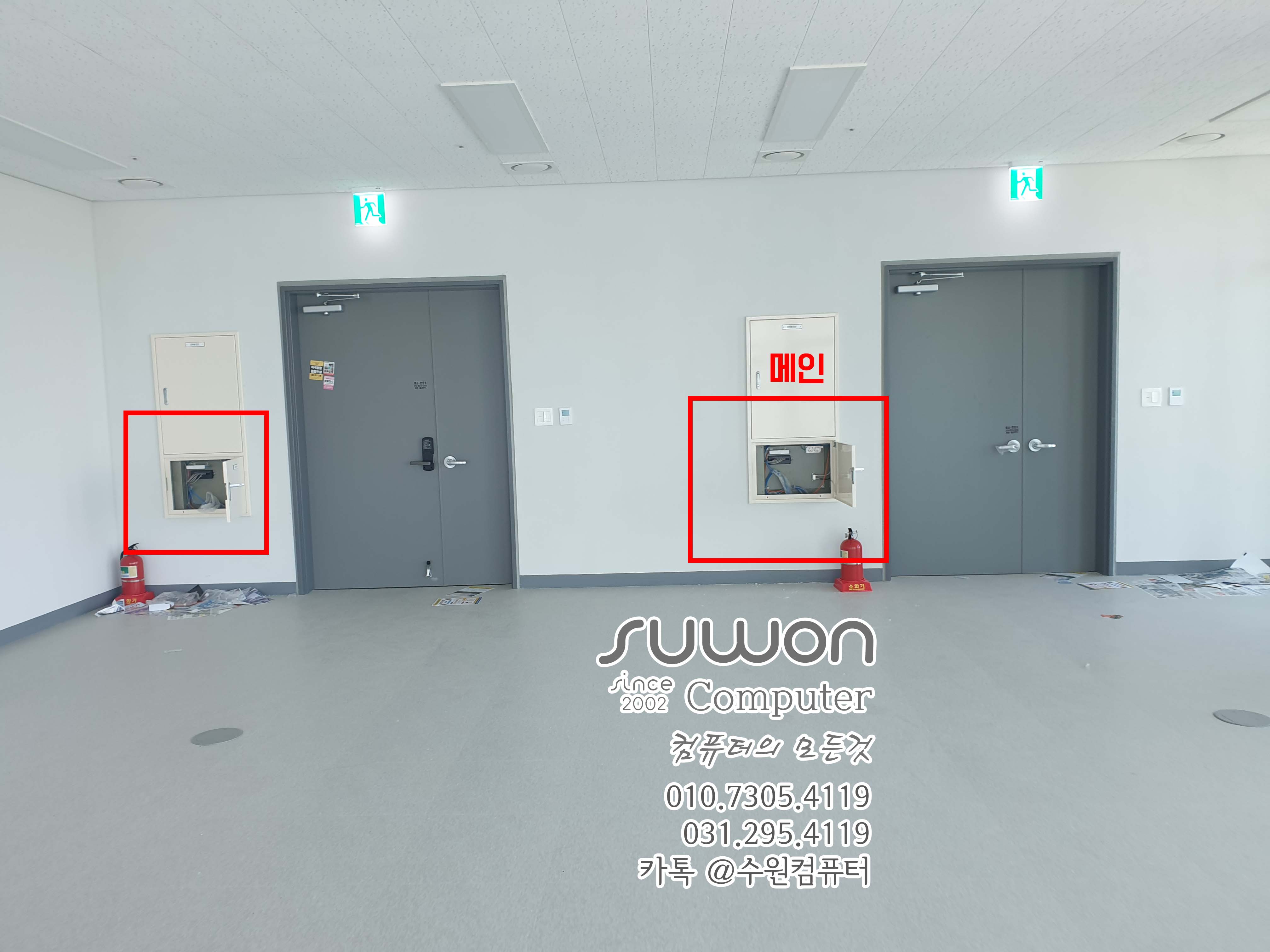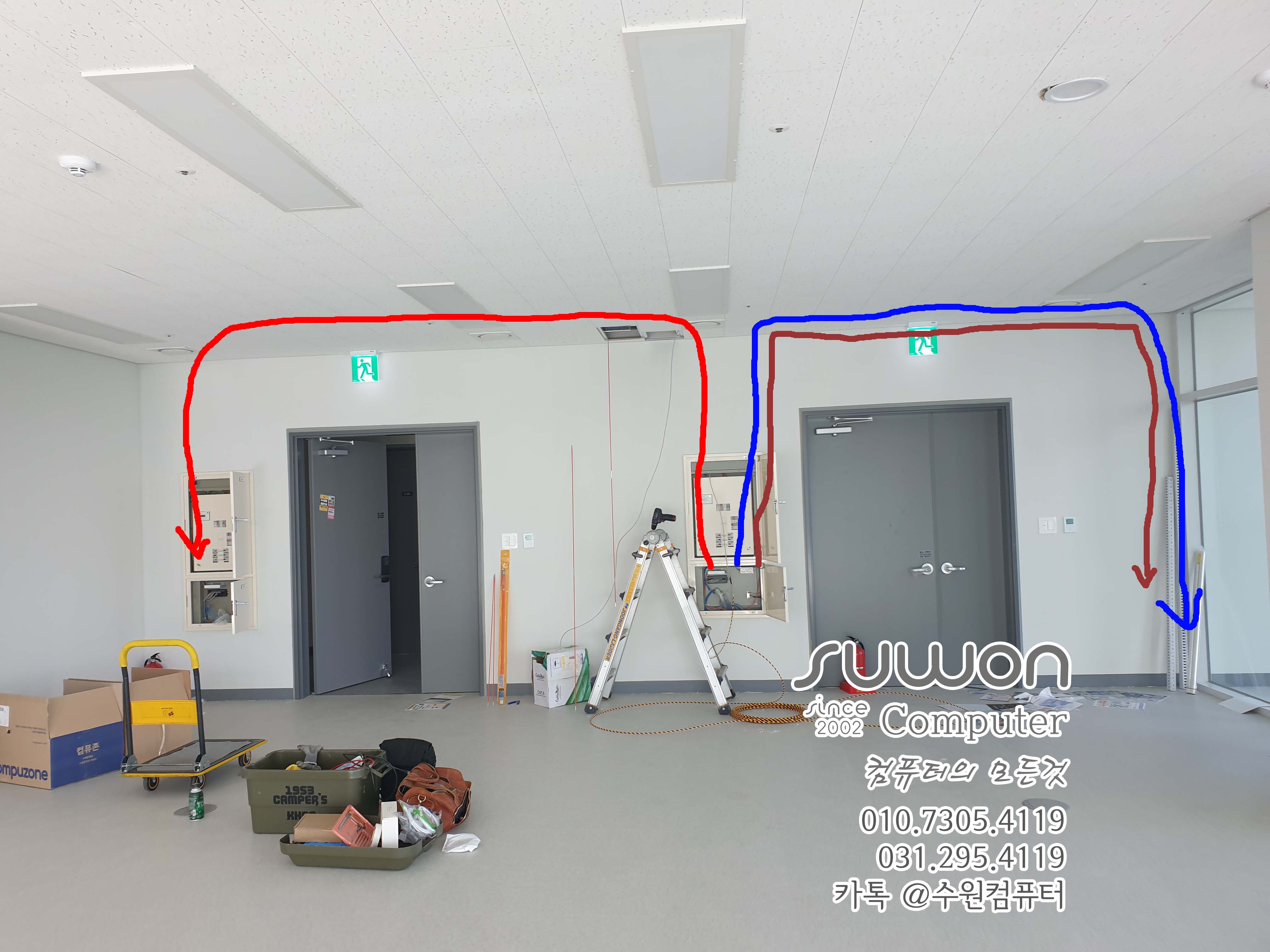 작업 후 메인박스 열어놓고 (사진) 담담자 전송 (인터넷 설치 때문에 꼭~ 체크 해야 합니다) 입구 전단지 등등 주변 정리 후 천장 네트워크 포설 마무리