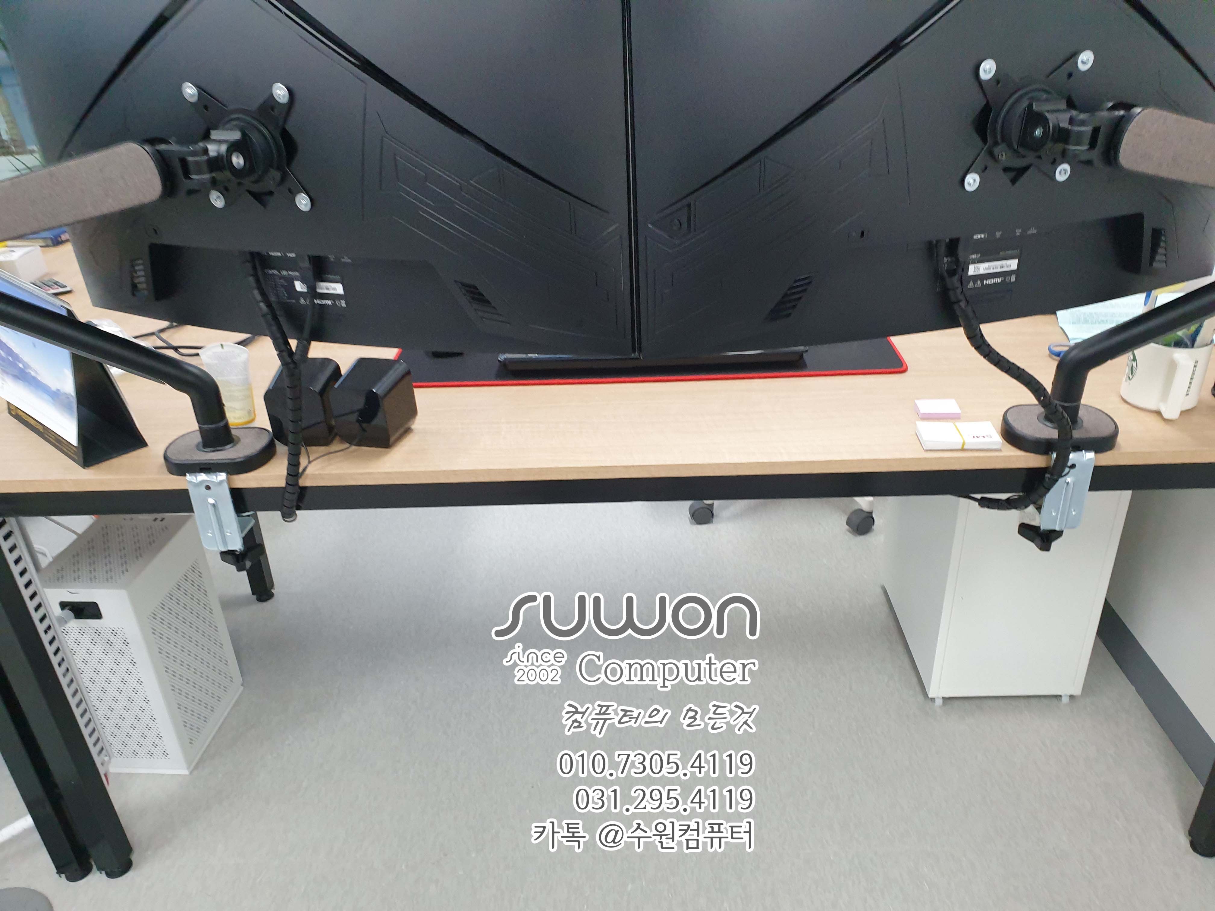 음.. 모니터 32인치 듀얼모니터 모니터 암으로 구성 고정해서 사용하는 제품은 모니터 다리쪽으로 정리하고 모니터를 위아래로 움직이시는 분들은 별도로 케이블로만 고정