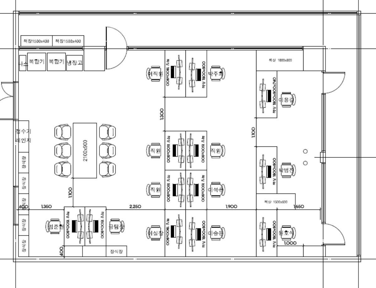 담당분께서 대표이사님이 지저분한걸 싫어 하신다고 합니다 음.. 시스템박스를 사용해서 각각 사용하기로 했습니다 시스템박스 위치가 우연치 않게? 책상 위치랑 비슷하게 위치해 있습니다