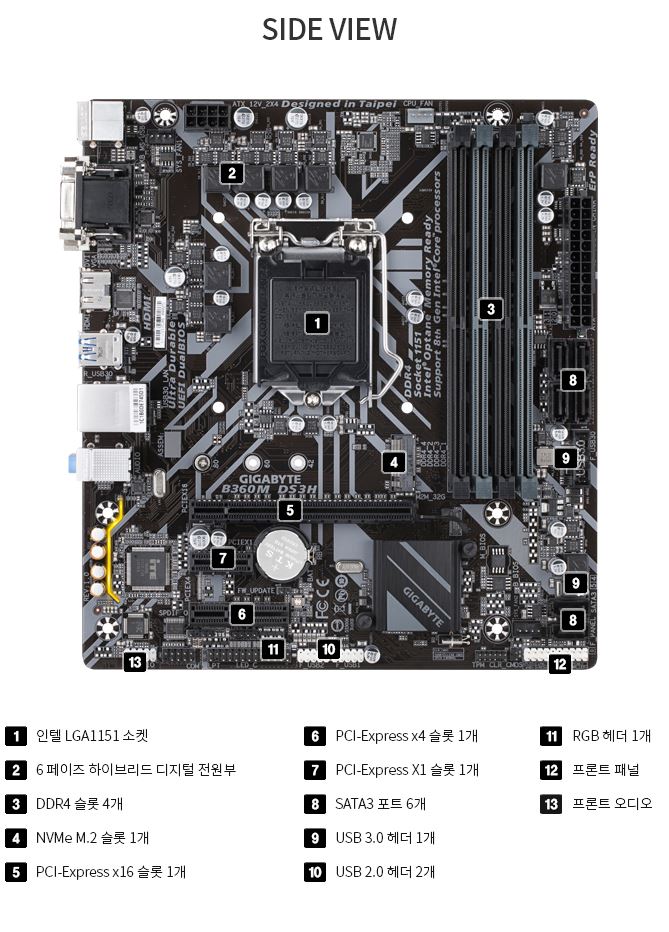 최대 160W / 전원부: 8+2페이즈 / 3개 팬 / 315mm / 백플레이트 / 오버클럭 물리키 / LED 라이트
